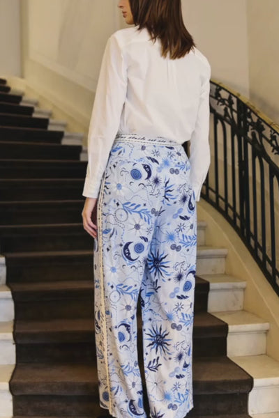 Pavia, le pantalon fluide droit à imprimé soleil, à taille haute, avec fermeture zippée et poches italiennes.