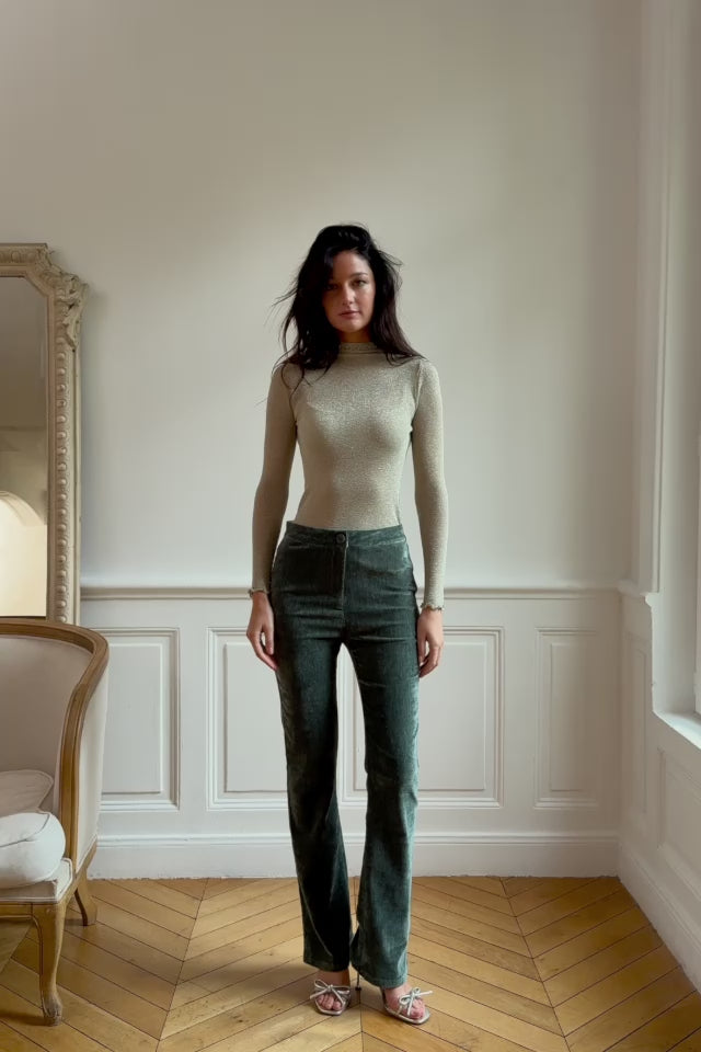 Poppy, un pantalon flare en velours lurexé vert amande, taille haute avec zip et bouton devant, parfait pour habiller les looks d’hiver.