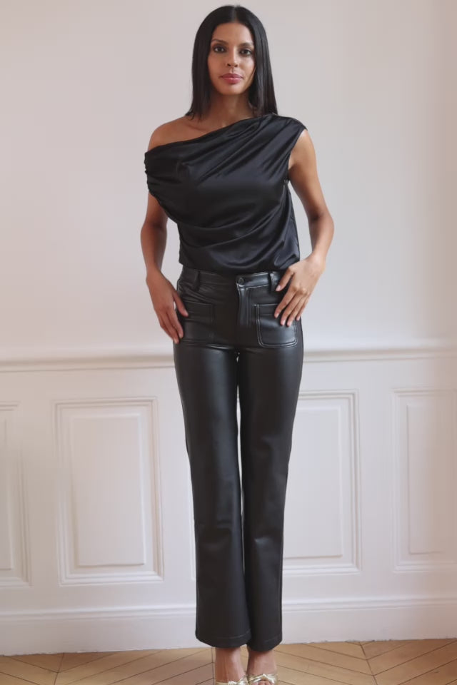 Sonnyta, un pantalon flare en simili cuir noir, taille haute avec zip et bouton devant, poches plaquées à l’avant et passepoilées au dos pour une touche actuelle.