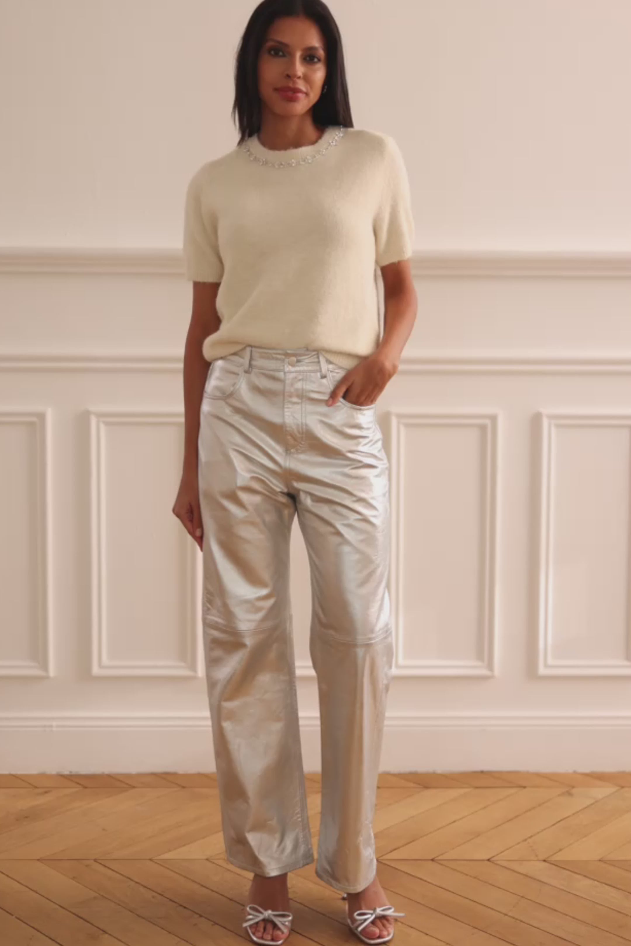 Zephyr, un pantalon droit en cuir argenté, taille haute avec poches et fermeture zippée à la ceinture, pour un look audacieux et tendance.