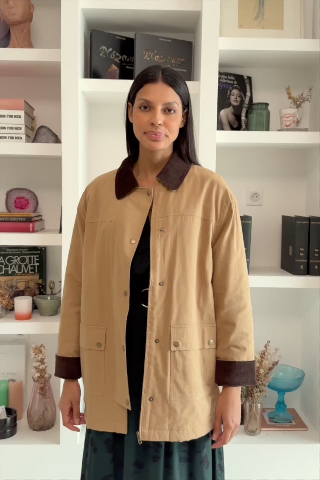 Vesly, la parka bi-matière Beige chic et confortable, avec col chemise, manches longues à revers et fermeture zip et boutons pression.