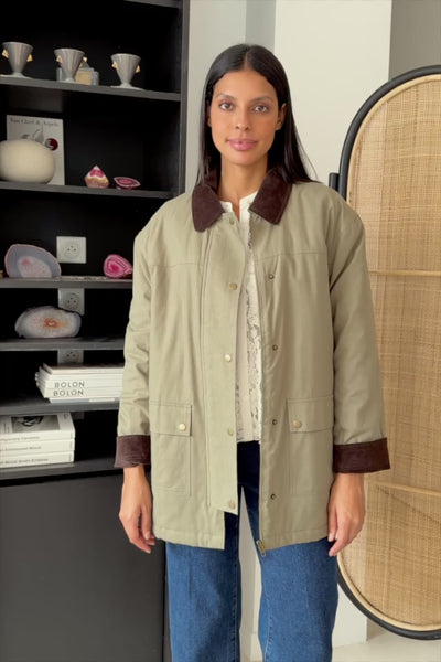 Vesly, la parka bi-matière Kaki chic et confortable, avec col chemise, manches longues à revers et fermeture zip et boutons pression.