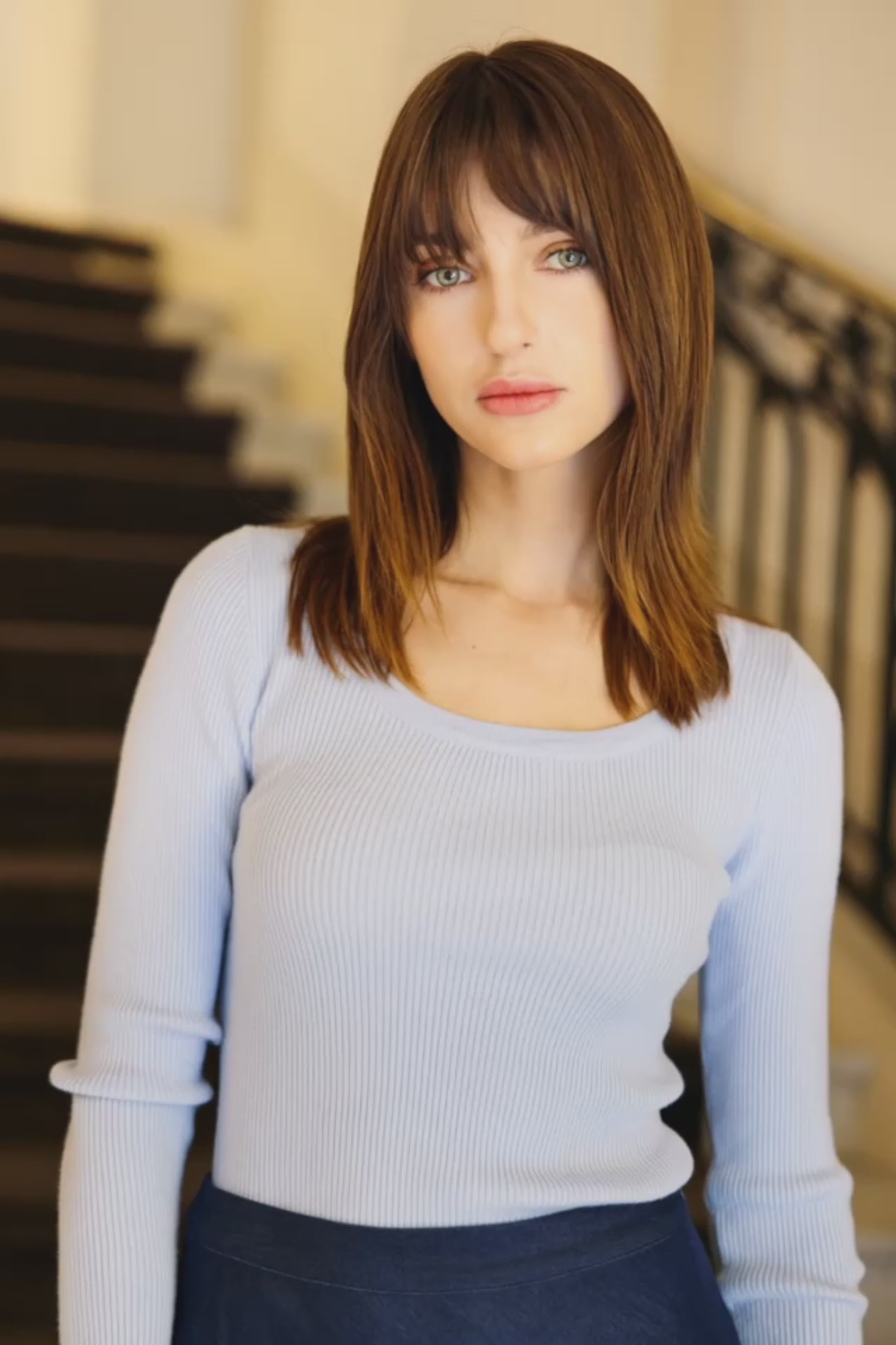 Manat, le top en maille ciel à coupe ajustée, avec encolure ronde profonde et manches longues.