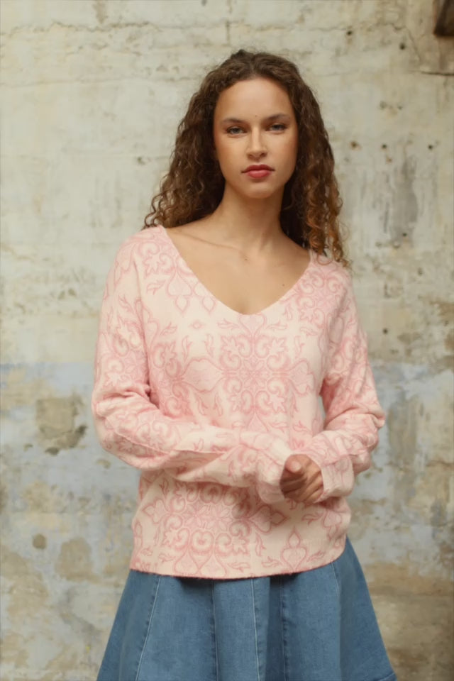 Margot, le pull à imprimé arabesque à coupe droite, réversible avec encolure en V à l’avant et ronde au dos, aux finitions bord-côte.