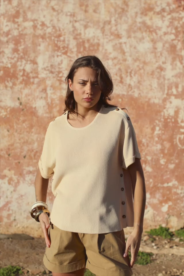 Mau est un t-shirt ample beige qui dessine une silhouette décontractée et naturelle. Sa coupe droite et ses emmanchures tombantes créent un tombé souple qui accompagne les mouvements avec légèreté, tandis que l’encolure ronde équilibre la ligne avec simplicité.