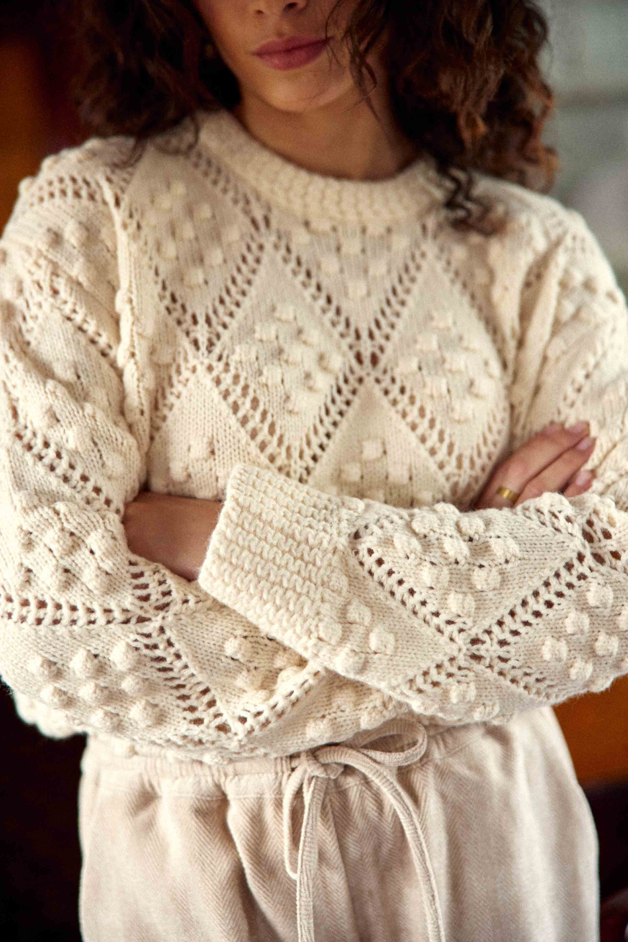 Mayan, un pull long et ample avec points fantaisie en relief, manches longues et finitions bord-côtes, pour un style confortable et élégant.