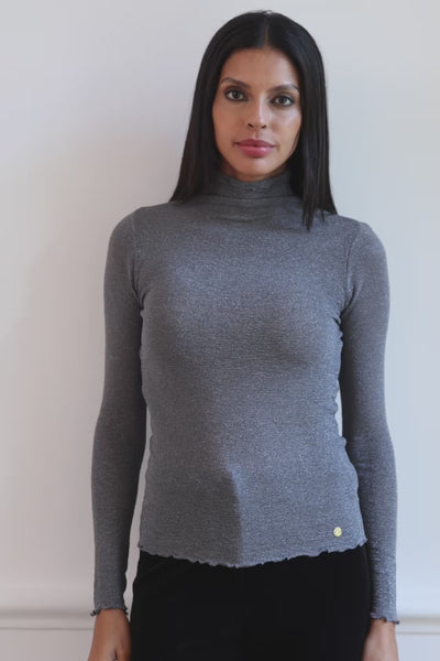 Meko, un pull col roulé près du corps en maille fine lurexée argentée, à manches longues, idéal sous une veste ou seul.