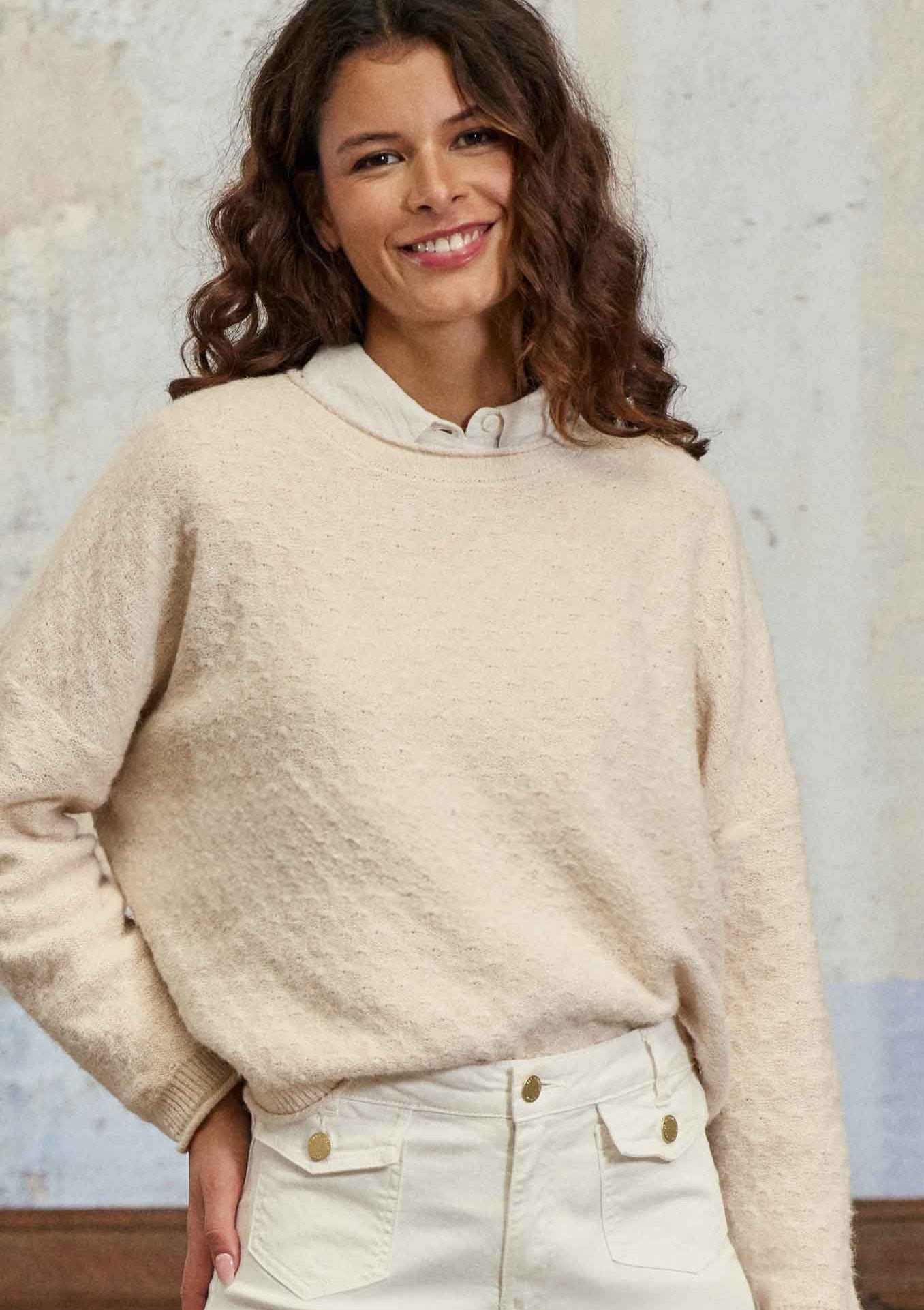 Mossy, le pull beige clair en maille à effet chiné, à coupe ample, avec encolure ronde et emmanchures tombantes.