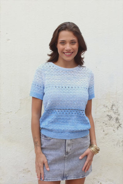 Myan est un top bleu en maille à la coupe blousante qui apporte du volume et équilibre la silhouette. Le point fantaisie et le dégradé donnent du relief à la matière, tandis que l’encolure ronde adoucit la ligne et met naturellement le haut du buste en valeur.