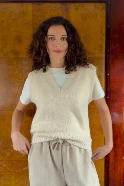 Mercy, un pull sans manches en maille douce, avec encolure en V et finitions bord-côtes, pour un look élégant et facile à superposer.