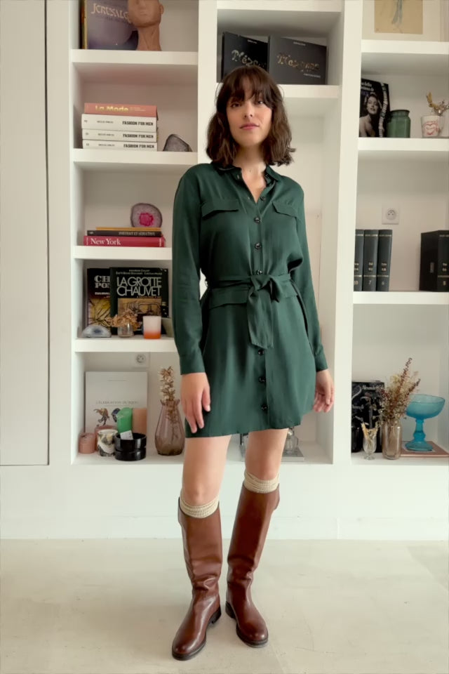 Roni, la robe courte Vert Anglais chic et féminine avec col chemise, poches à rabat et ceinture amovible pour sublimer la silhouette.