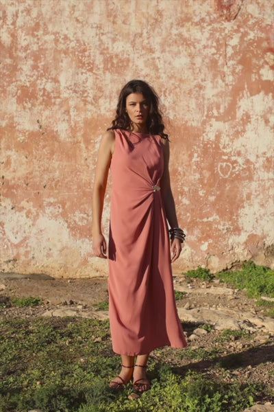 Rosa est une robe midi blush qui capte la lumière par sa ligne asymétrique et son drapé élégant. Les plis qui partent de l’épaule et se rejoignent à la taille dessinent une silhouette féminine et structurée, tandis que la coupe suit le mouvement avec fluidité. La broche dorée souligne la taille et apporte une touche lumineuse.