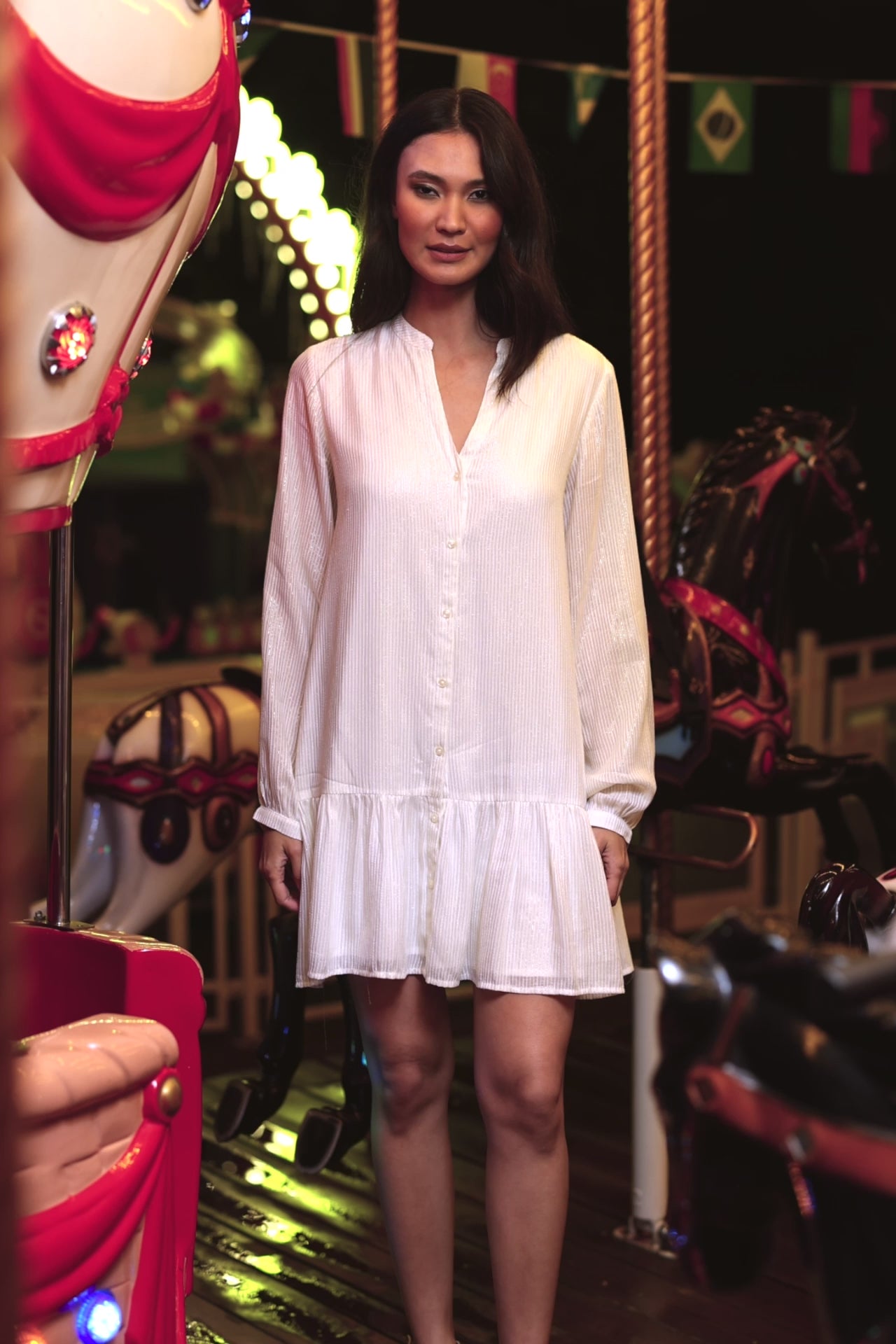 Roselia, une robe courte ample écru à tissu rayures lurex, avec encolure en V, manches longues et fronces au bas, fermeture à boutons nacrés pour un style élégant et féminin.