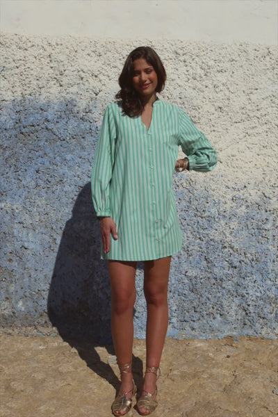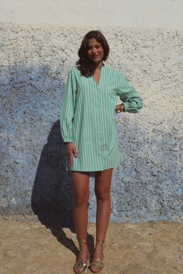 Rosetta est une robe courte écrue et verte à la coupe trapèze qui apporte de la légèreté et de la fluidité à la silhouette. Ses rayures donnent du relief et une touche fraîche qui attire le regard, tandis que l’encolure en V met délicatement le buste en valeur et équilibre la ligne.