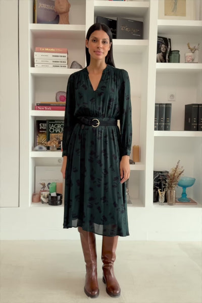 Ryan, la robe longue à imprimé floral, fluide et féminine, avec taille élastiquée et corps doublé pour un confort élégant.