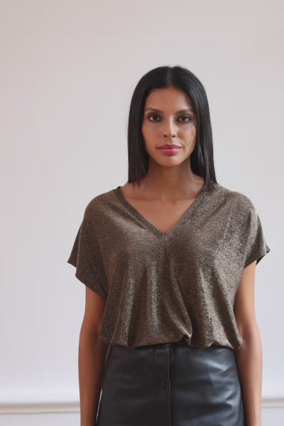 Marcelina, un t-shirt ample en tissu fluide mordoré, avec encolure en V et emmanchures tombantes, pour une allure chic et décontractée à la fois.