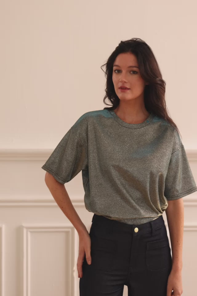 Tais, un t-shirt oversize en maille lurexée verte, avec col rond, manches courtes et broderie étoile dorée à l’encolure pour une touche subtile