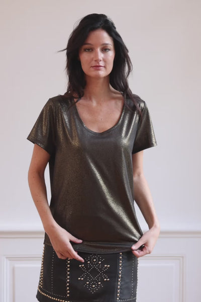 Tia, un t-shirt droit et ample en tissu lurexé mordoré, avec encolure ronde et manches courtes, idéal pour rehausser une tenue.