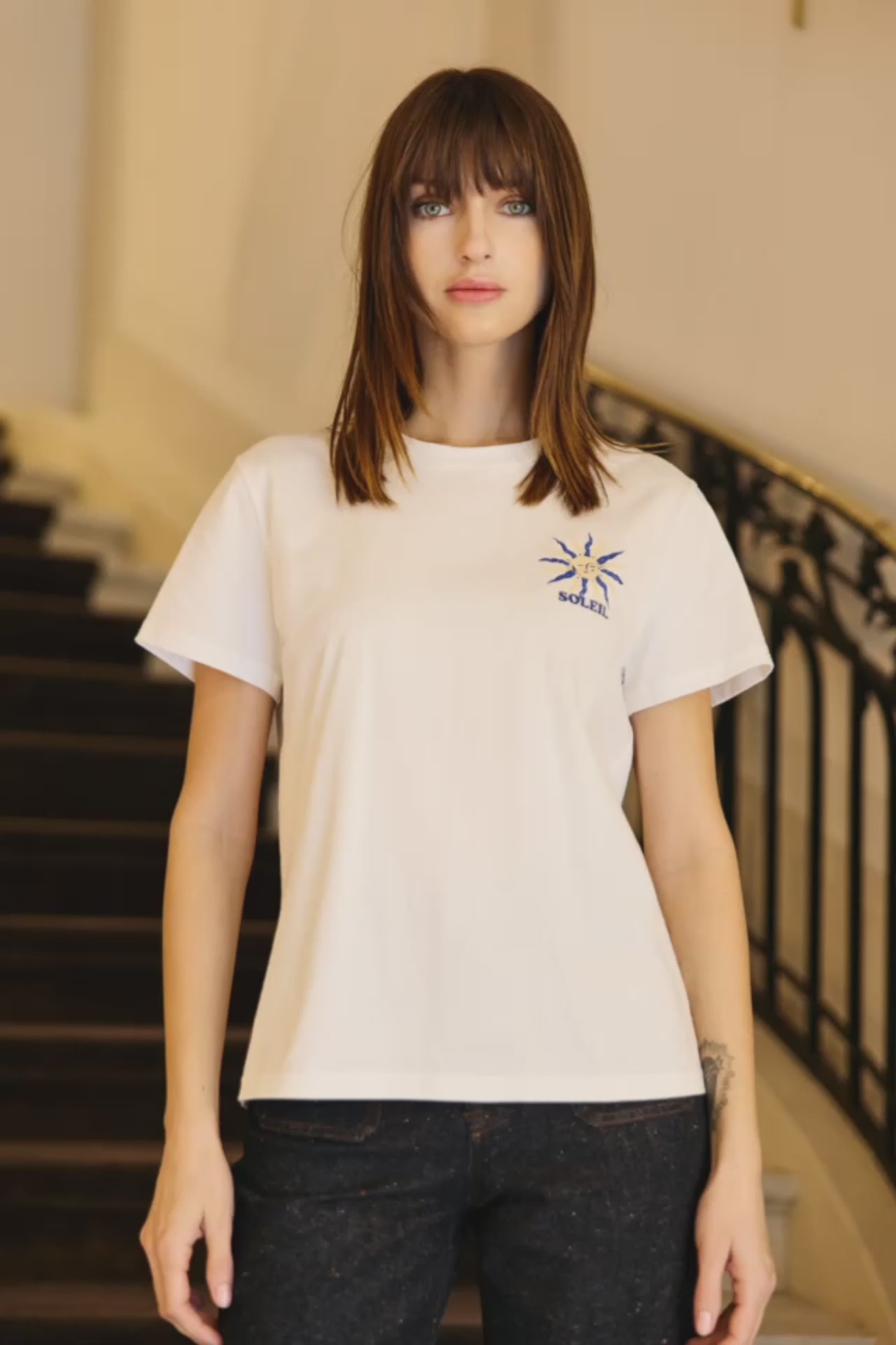 Tola, le t-shirt droit en coton écru, avec sérigraphie soleil devant et au dos.