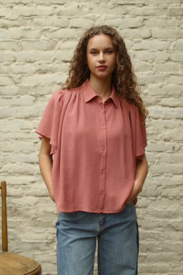 Tobia, le chemisier rose à coupe ample et évasée, en tissu texturé effet gaufré, avec col chemise classique et manches papillon.