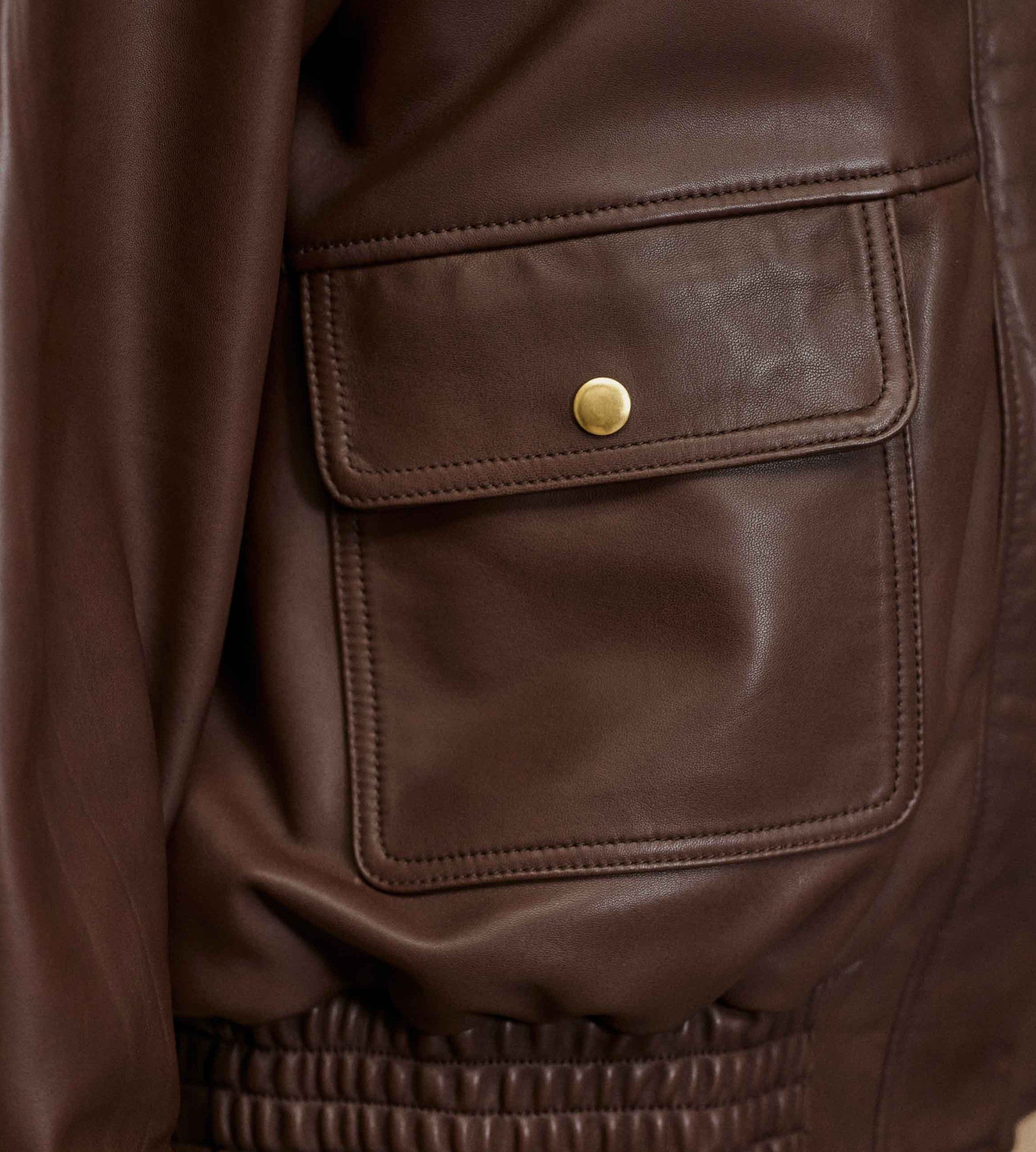 Floy, le blouson marron en cuir lisse à coupe oversize, longueur hanche, avec col montant évasé et finitions structurées.