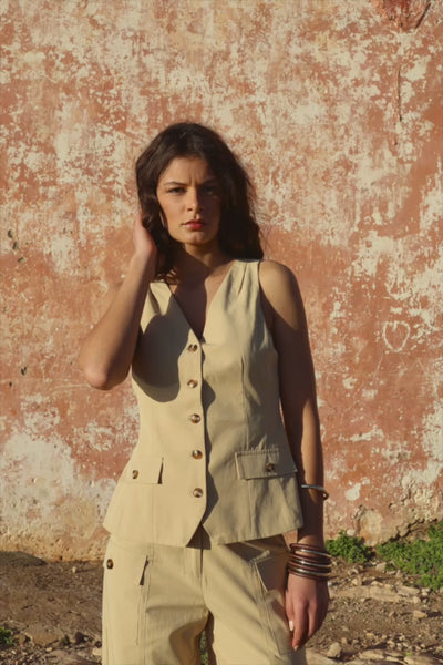 Nea est un gilet sans manches camel qui structure la silhouette avec élégance. Sa coupe ajustée souligne la taille tandis que l’encolure en V dégagée élance le haut du corps. Le boutonnage devant et les rabats de poches apportent du caractère à la pièce tout en conservant une ligne nette et féminine.