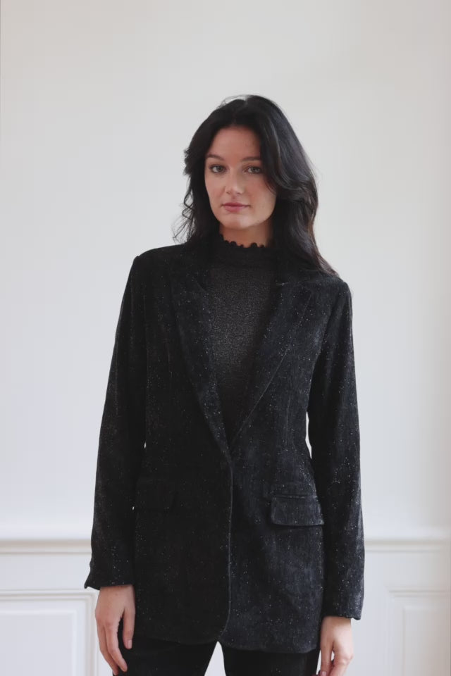 Valley, une veste tailleur droite en velours lurexé noir, avec poches à rabat et doublure intégrale, parfaite pour une allure habillée.