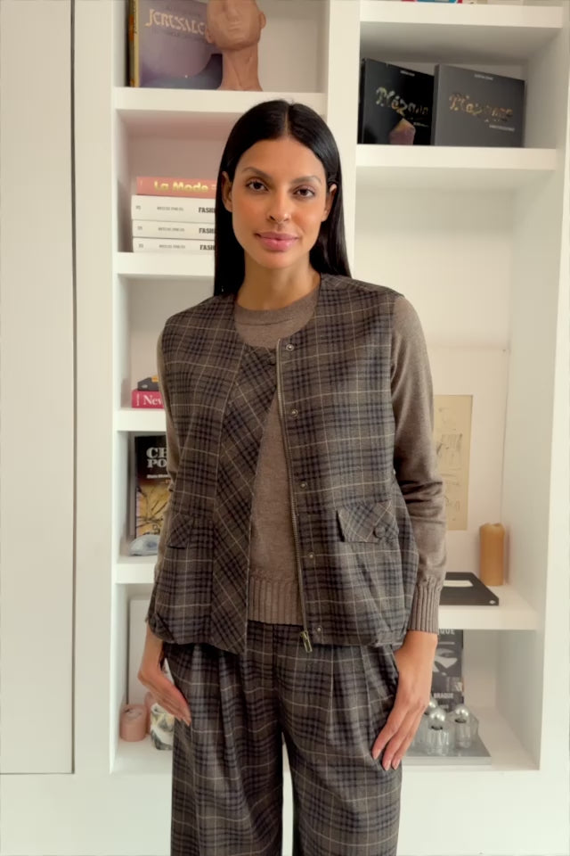 Vance, la veste sans manches à tissage carreaux, moderne et élégante, avec encolure ronde et effet blousant.