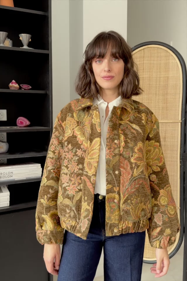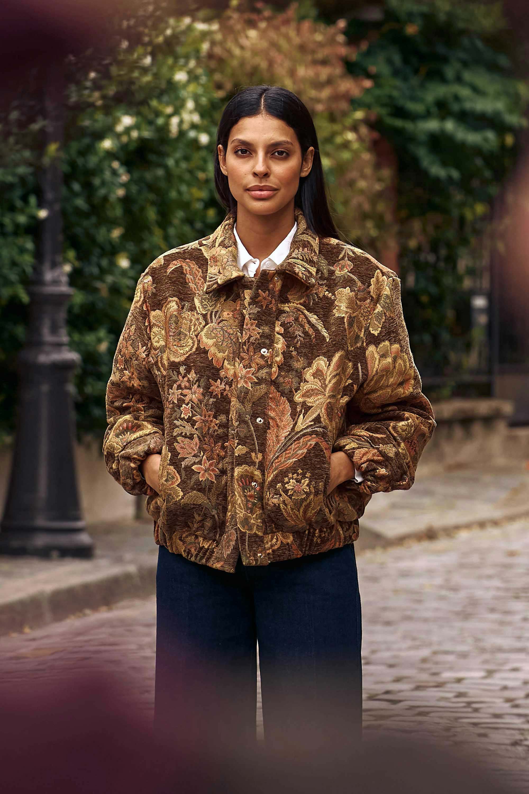 Vany, la veste style teddy en tissage jacquard, tendance et confortable, avec col chemise et finitions élastiquées aux poignets et à la base.