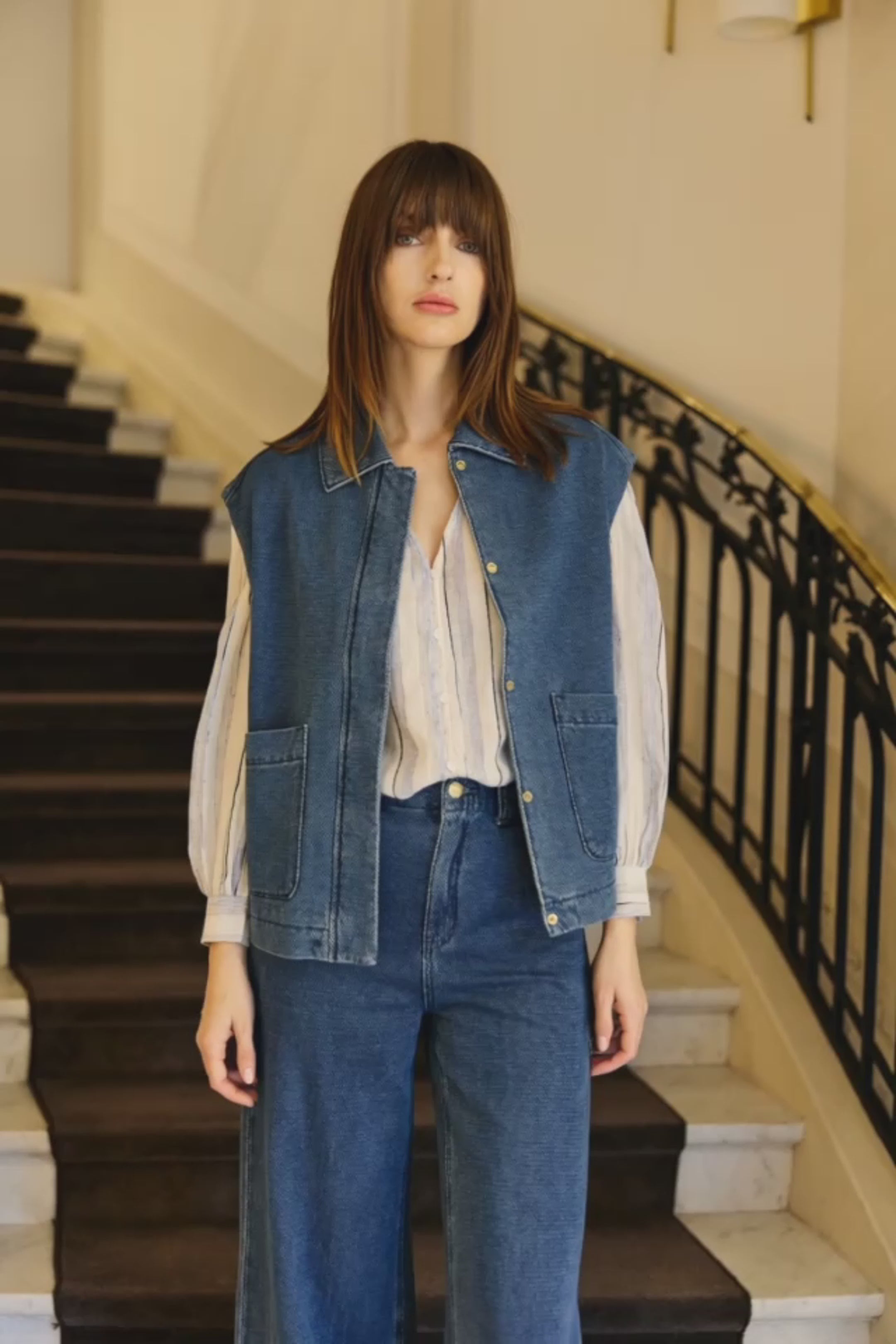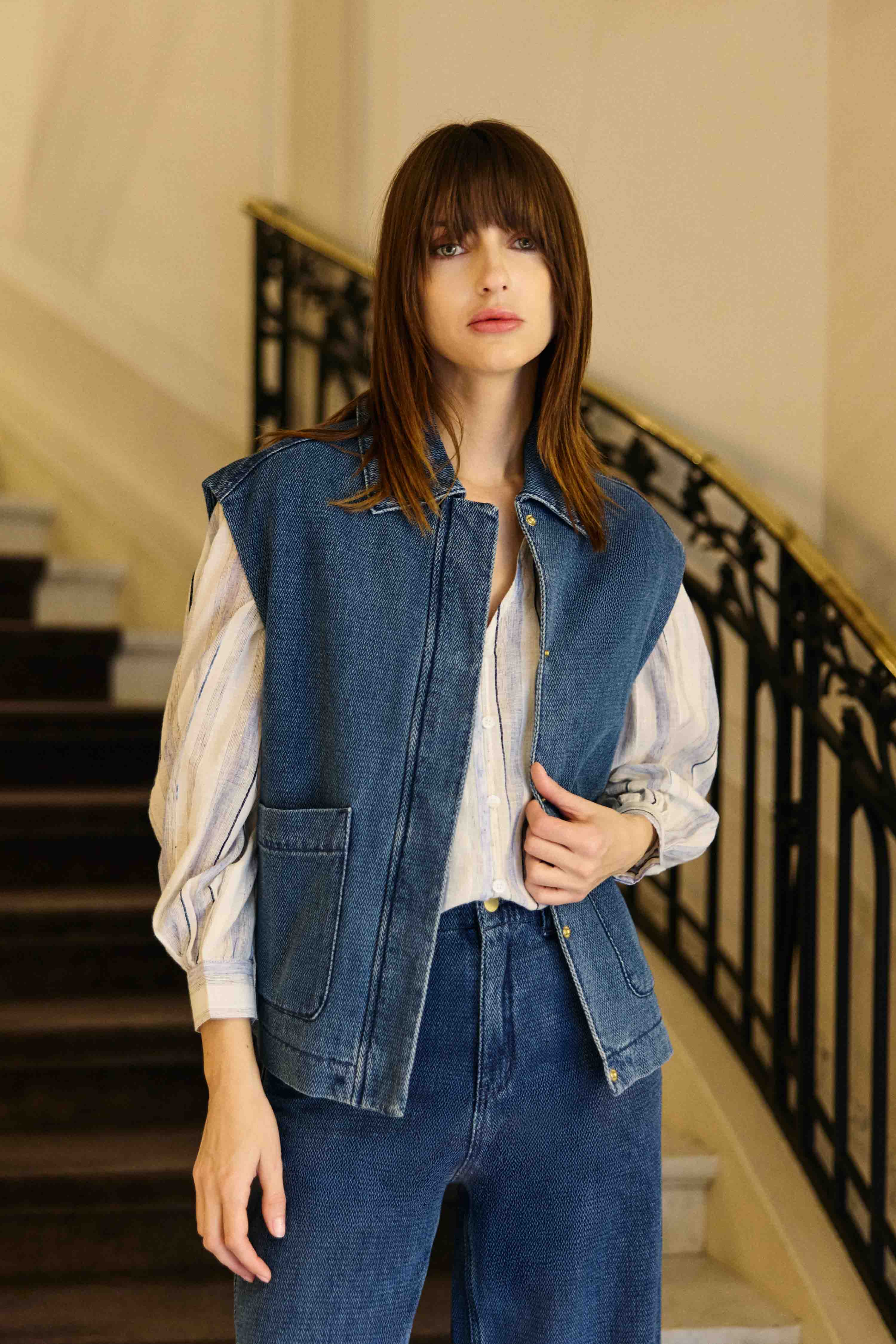 Vaya, la veste sans manches en denim jacquard double wash, à coupe large, avec col chemise et poches plaquées.