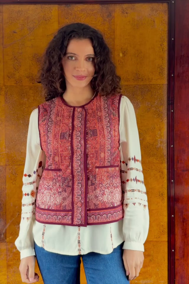 Velda, une veste sans manches en velours côtelé avec imprimé inspiré des motifs amérindiens, encolure ronde, poches plaquées et boutons recouverts, pour un style bohème chic.