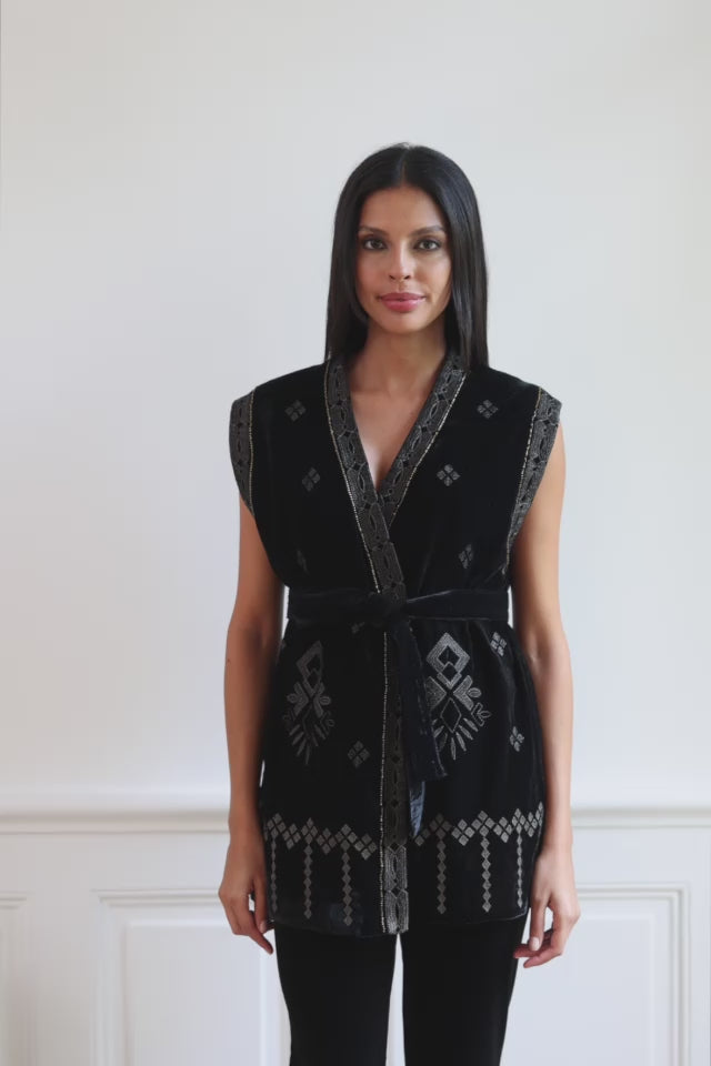 Vitty, une veste sans manches droite en velours noir brodé de perles, avec croisé cache-cœur et ceinture amovible pour marquer la taille.