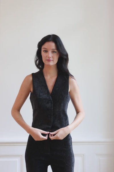 Volie, un veston sans manches en velours lurexé noir, avec encolure en V et boutonnage devant, idéal pour compléter un look habillé.